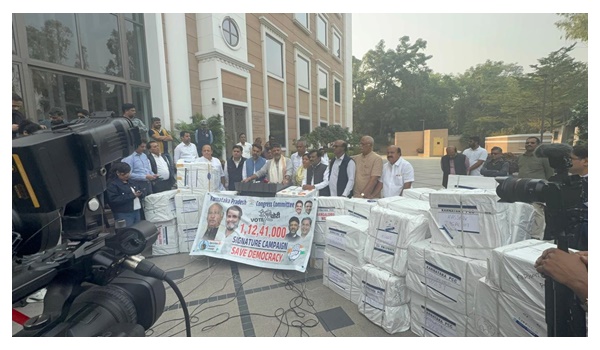 New Delhi, Nov 11: Deputy Chief Minister and KPCC President D K Shivakumar today handed over to AICC President Mallikarjun Kharge a box containing 1.12 crore signatures collected as part of a signature campaign against vote theft.