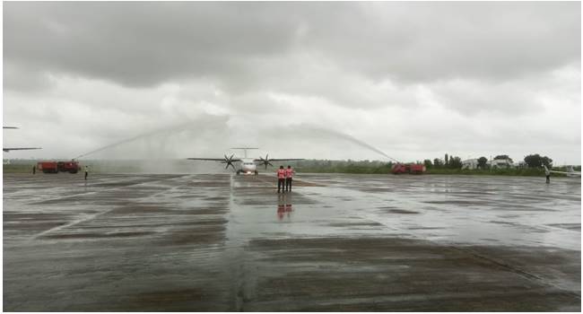 The maiden Indigo Flight to Belagavi Airport was welcomed with Water Salute by Fire