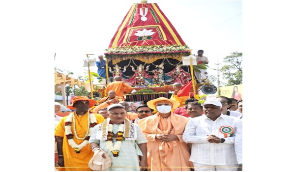 ಪುಷ್ಪಾಲಂಕೃತ ರಥದಲ್ಲಿ ರಾಧಾ ಕೃಷ್ಣ, ನಿತ್ಯಾನಂದ ಮಹಾಪ್ರಭು ಮತ್ತು ಗೌರಾಂಗ ಮಹಾಪ್ರಭುಗಳ ಸುಂದರ ವಿಗ್ರಹಗಳನ್ನು ಪ್ರತಿಷ್ಠಾಪಿಸಲಾಗಿತ್ತು. ರಥದ ಪೂಜೆ ಮತ್ತು ಆರತಿಯ ನಂತರ ಸಂಸದರಾದ ಈರಣ್ಣ ಕಡಾಡಿ ಅವರು ಶ್ರೀಫಲ ಸಮರ್ಪಿಸಿ ರಥಯಾತ್ರೆಗೆ ಅಧಿಕೃತ ಚಾಲನೆ ನೀಡಿದರು. ರಥದ ಮುಂಭಾಗದ ಎರಡು ಬದಿಗಳಲ್ಲಿ ಹಗ್ಗಗಳನ್ನು ಕಟ್ಟಲಾಗಿದ್ದು, ಎಡಭಾಗದಲ್ಲಿ ಪುರುಷರು ಮತ್ತು ಬಲಭಾಗದಲ್ಲಿ ಮಹಿಳೆಯರು ಭಕ್ತಿಯಿಂದ ರಥವನ್ನು ಎಳೆದರು.