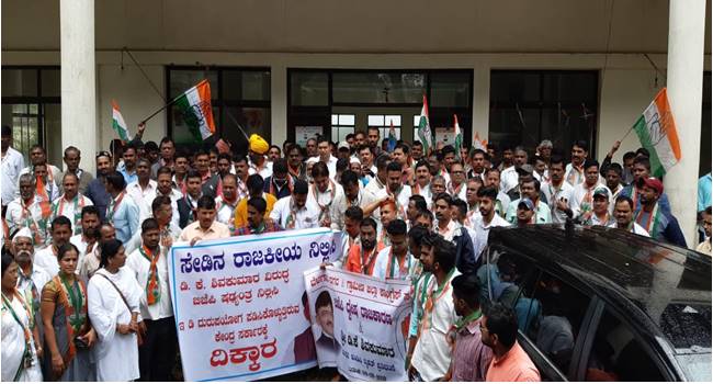 ಮಾನವ ಸರಪಳಿ ನಿರ್ಮಿಸಿದ ಕಾರ್ಯಕರ್ತರು, ನಾವೆಲ್ಲರೂ ಡಿ ಕೆ ಶಿವಕುಮಾರ ಅವರ ಬೆಂಬಲಕ್ಕೆ ಇದ್ದೇವೆ. ಇದು ಪ್ರಜಾಪ್ರಭುತ್ವದ ಕಗ್ಗೊಲೆ ಎಂದು ಘೋಷಣೆ ಕೂಗಿದರು.